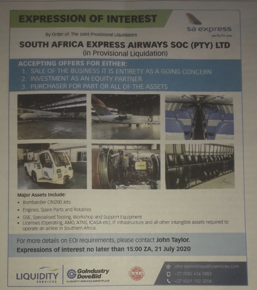 SA Express’s joint provisional liquidators have mandated asset disposal consultancy firm, GoIndustry DoveBid, to issue an ‘Expression of Interest’ notice to test the market’s appetite for a buyer for the airline, equity partner investors or purchasers for all or part of the airline’s assets.