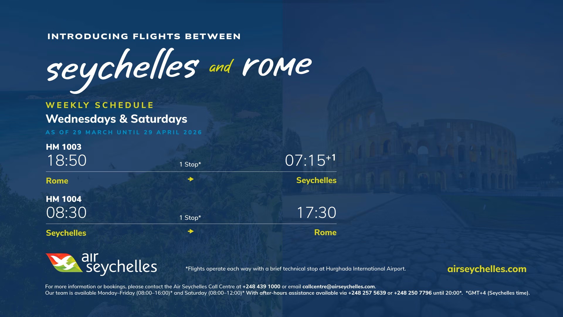 Air Seychelles has announced a new twice-weekly service to Rome Fiumicino Airport, Italy, beginning on March 29.
